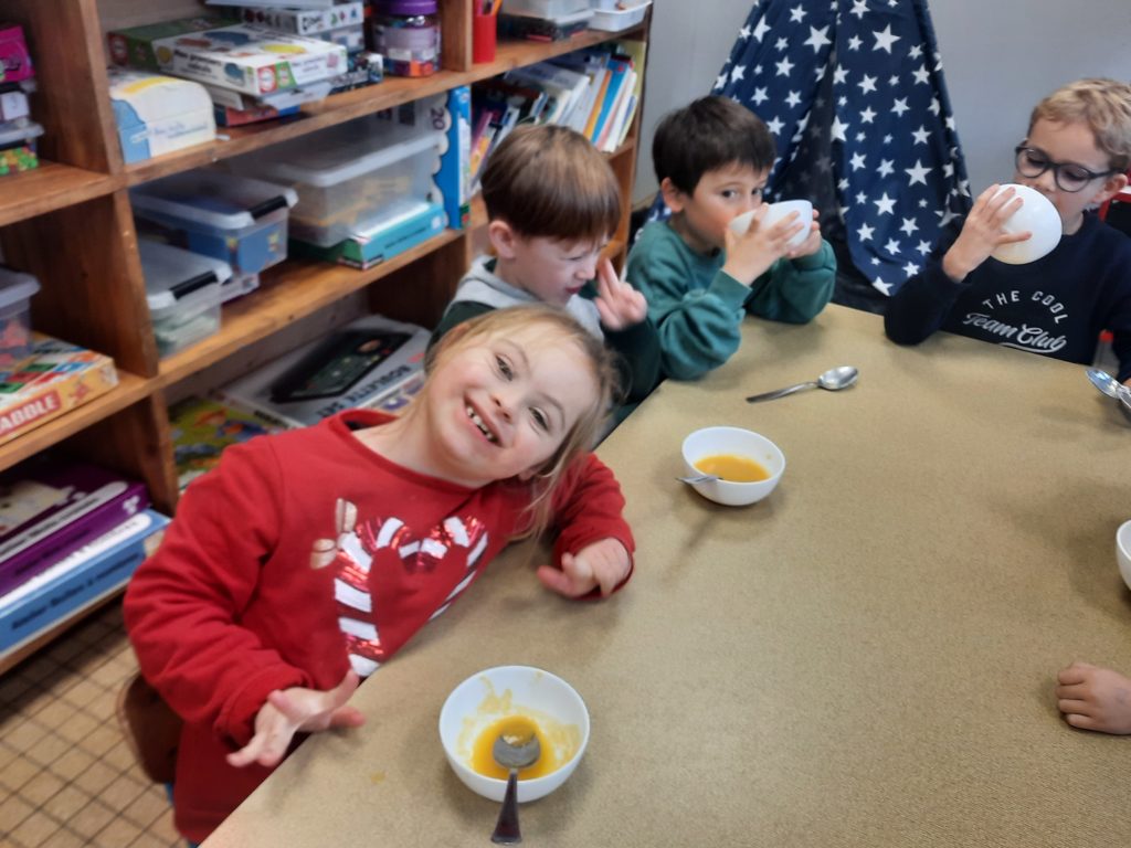 Le vendredi 28 novembre, nous avons fait un atelier “Cooking”. Après avoir travaillé sur les sorcières et en particulier sur l’album “Une soupe 100% sorcière”, nous avons cuisiné notre soupe carottes, poireaux, pommes de terre.