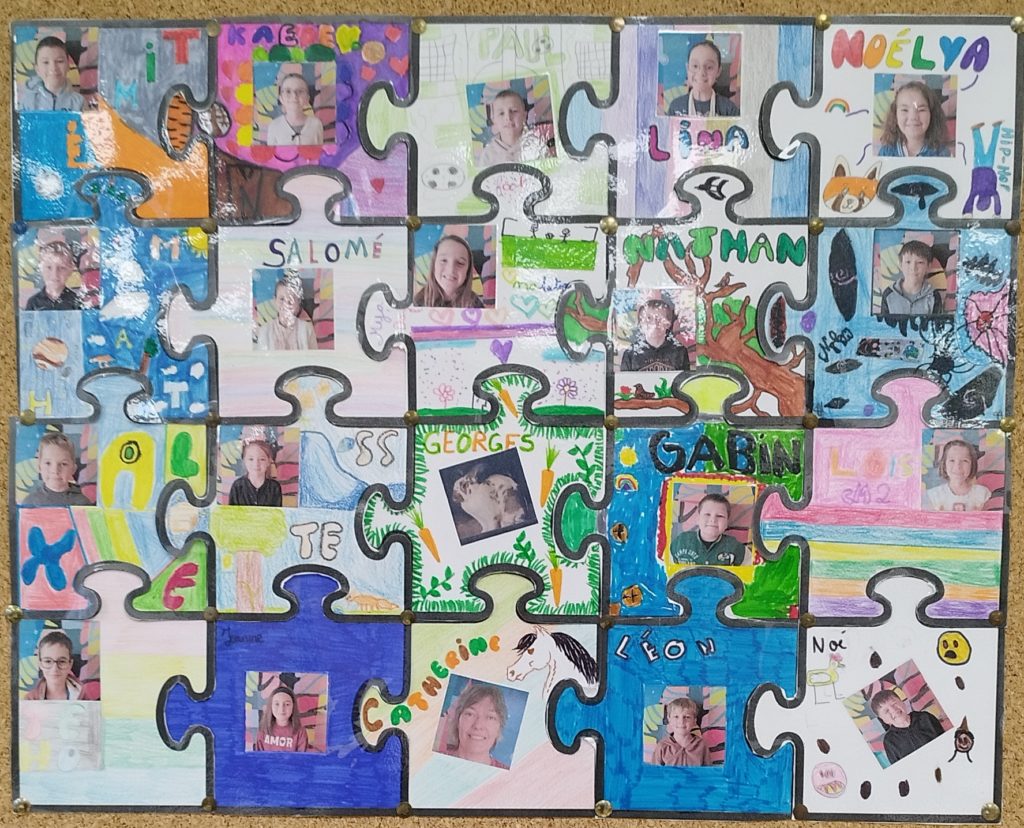 Voici notre première oeuvre collective en arts visuels. Nous sommes un groupe classe et le puzzle, c’est une façon de se dire que l’on est solidaires les uns des autres. Nous avons besoin les uns des autres pour avancer, progresser, grandir. Un joli symbole pour une classe bien soudée.