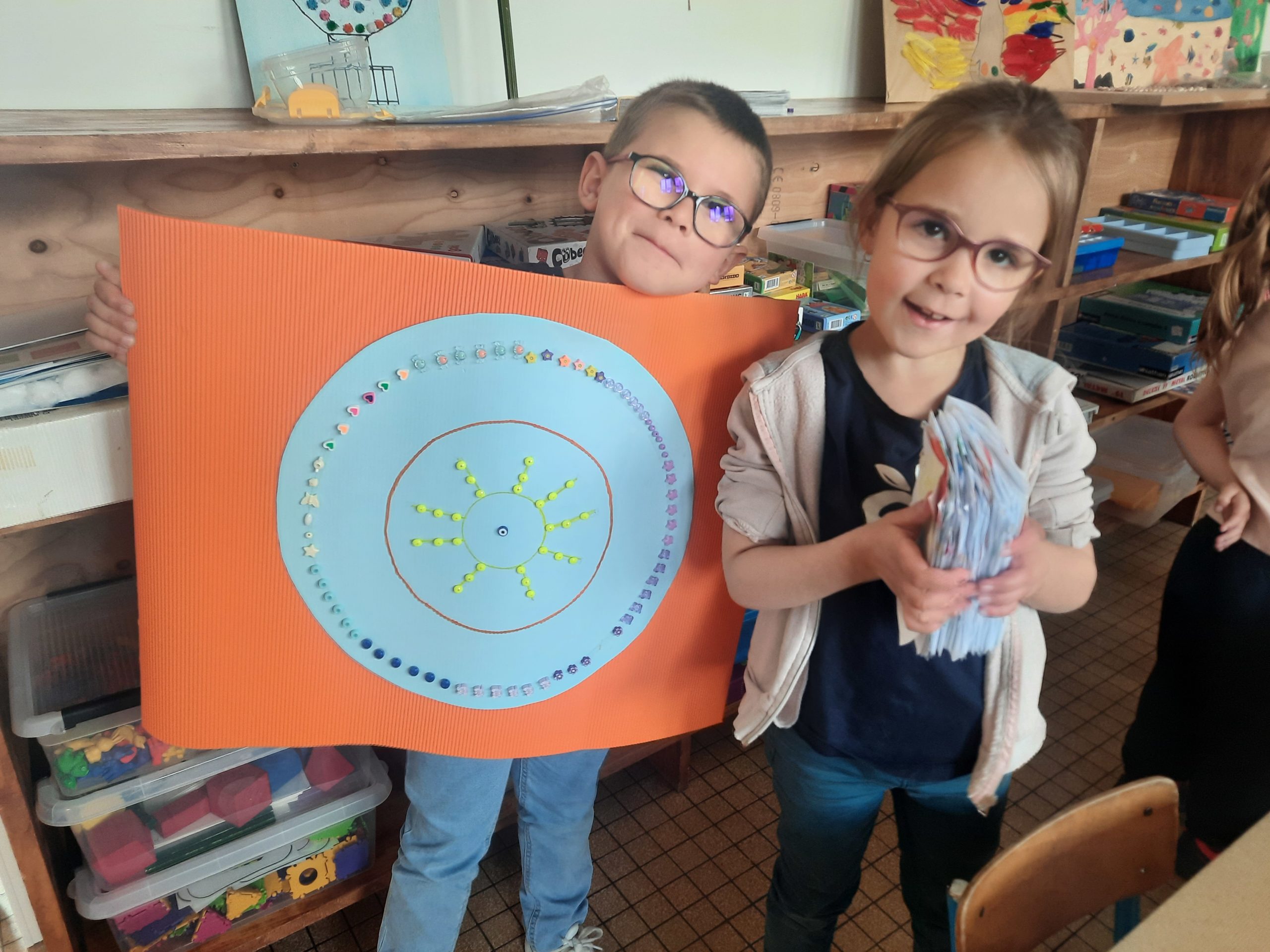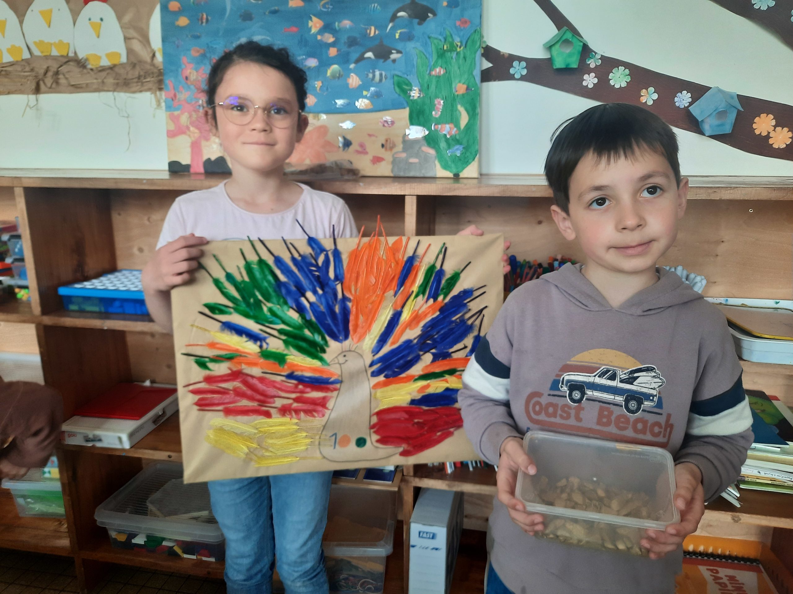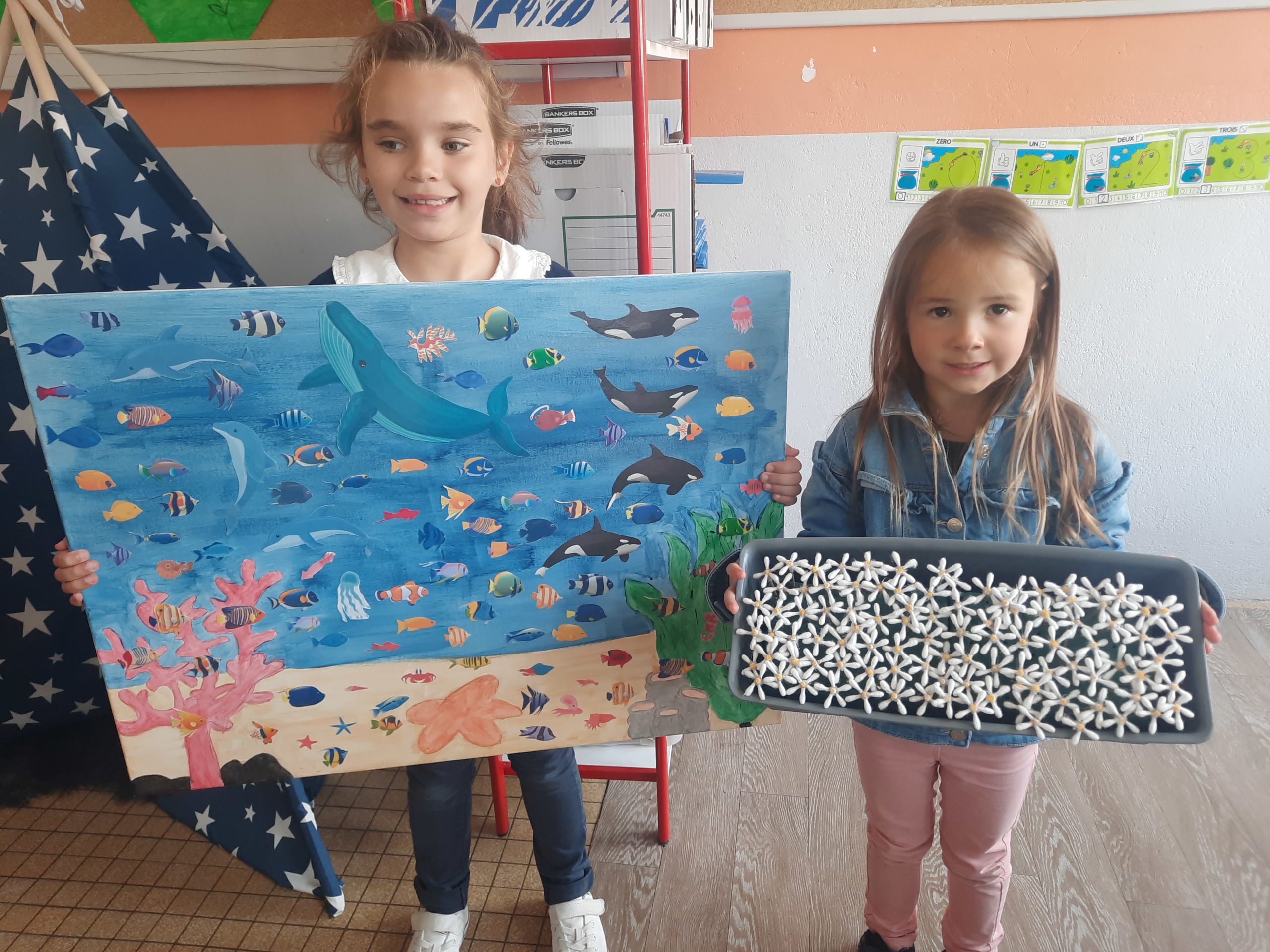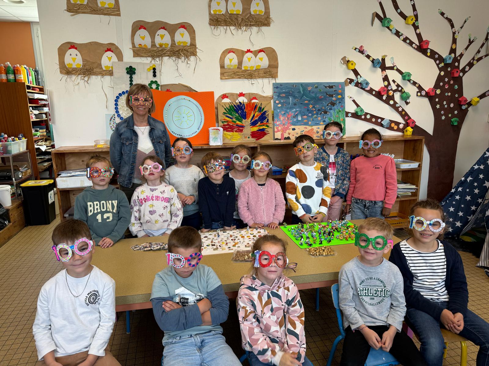 La journée a débuté par la fabrication de lunettes “100” que les enfants ont fièrement portées. Un projet artistique collectif a également été réalisé : chacun a découpé des poissons, pour créer ensemble un aquarium géant composé de 100 poissons !