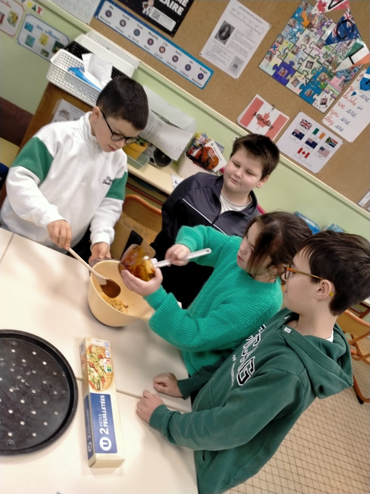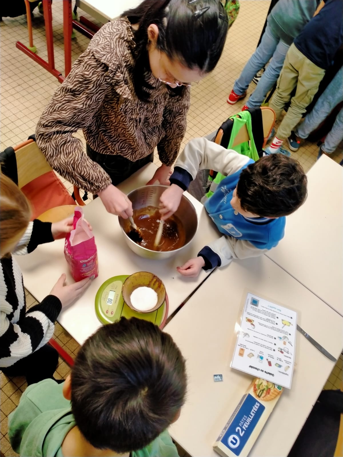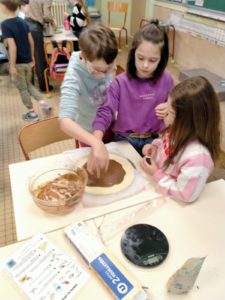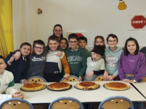 Le midi, c’est David qui a fait cuire nos galettes dans les fours de la cantine pendant que nous mangions. Ainsi, nous avons pu les récupérer à 13 heures et après la récréation, nous avons porté nos galettes dans les différentes classes et nous avons dégusté la nôtre. Elle était délicieuse (la recette est avec les photos).