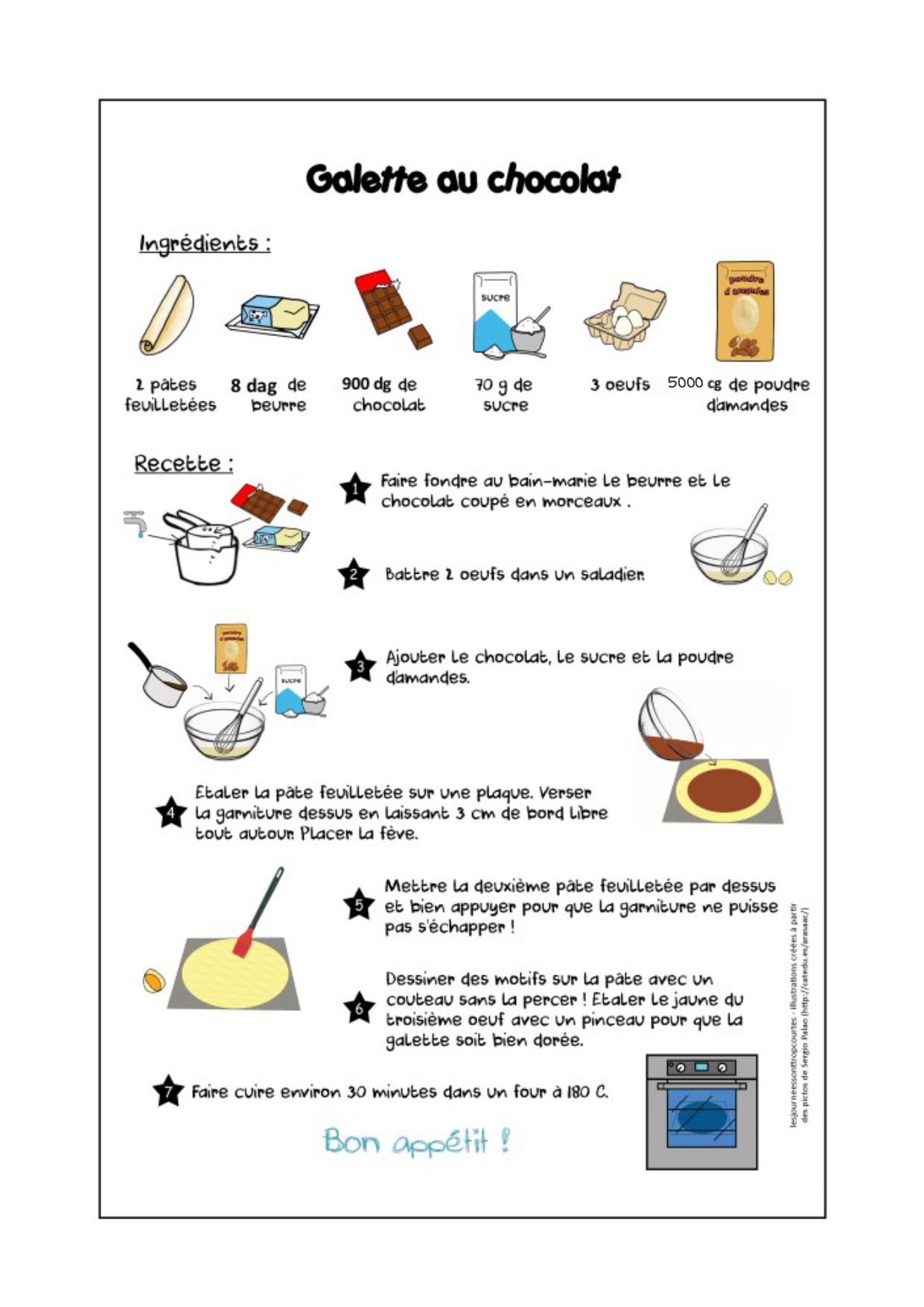 Aujourd’hui, dans la classe nous avons (enfin !) pu faire notre galette des rois. Comme les enfants de maternelle et CP nous avaient confectionné une galette la semaine dernière, nous avons décidé de faire, nous aussi, une galette pour chaque classe. Nous avons donc formé 4 groupes, et hop ! nous avons commencé notre cuisine. Tout d’abord, comme la maîtresse nous avait tendu un piège en mettant certaines mesures en centigrammes, d’autres en décagrammes, d’autres encore en décigrammes, il a fallu tout convertir pour tout mettre en grammes.