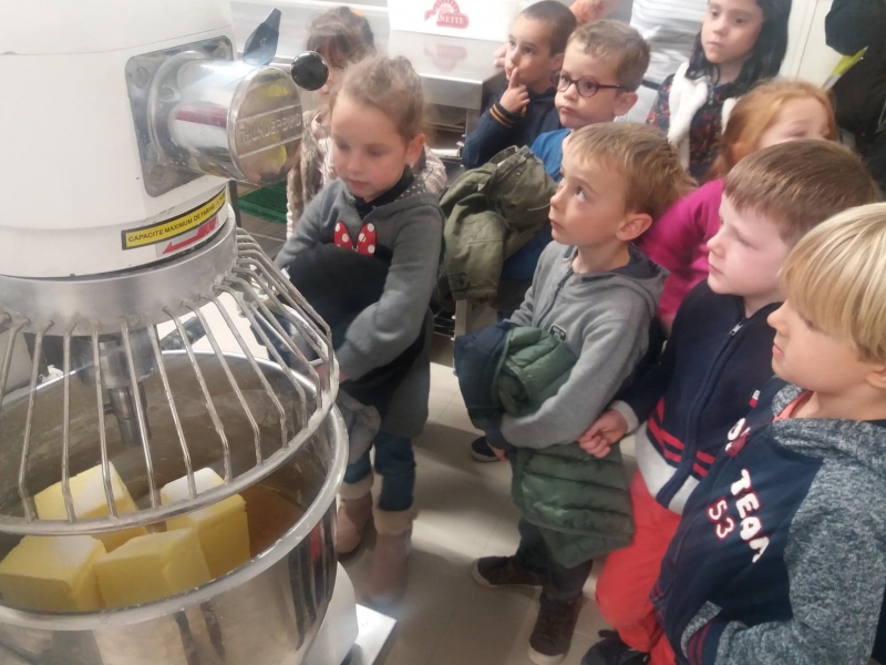“Nous sommes allés à la boulangerie d’Erbray. Jérémy et Emilie (le papa et la maman de Noélya) nous ont fait visiter. Il y a le laboratoire du pâtissier, le fournil et le magasin. Nous avons vu des machines: le pétrin, le four, les frigos, le batteur…