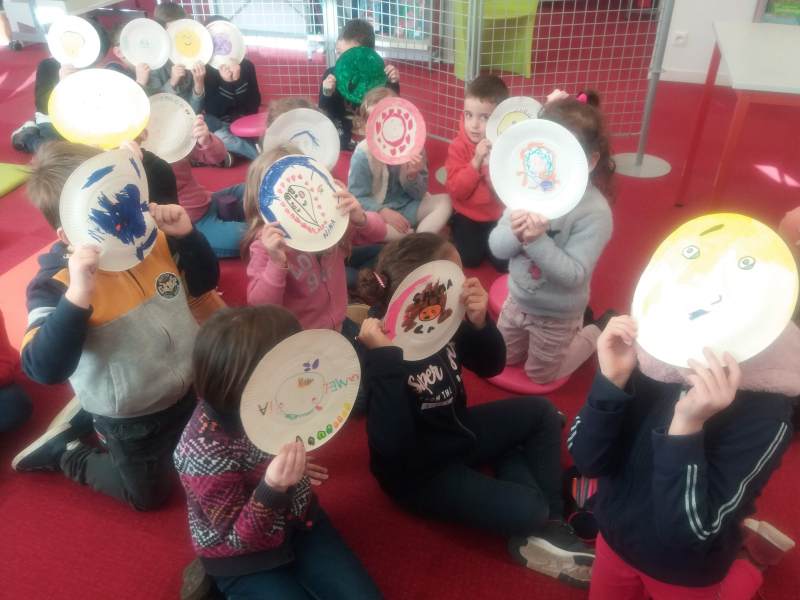 Ensuite, nous avons réalisé nos propres masques sur des assiettes en carton. Nous devions dessiner et colorier pour refléter une émotion. Ensuite, chacun notre tour nous avons mis notre “tête” et fait deviner aux autres enfants l’émotion présente sur notre masque: rouge de colère, larmes de tristesse, sourire de sérénité, cœurs pour l’amour ou sourire pour la joie… Chacun a pu exprimer une émotion.