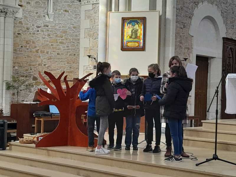 En ce début de carême, tous les élèves se sont rendus à l’église pour une célébration des cendres animée par le Père Patrice Eon.Cette célébration était placée sous le signe du CŒUR… Durant cette période de carême, nous allons “dépoussiérer nos cœurs”, “changer nos cœurs”, “ouvrir nos cœurs à la joie”… Toutes ces expressions ont été reprises et écrites sur des cœurs que nous avons laissés à l’église. Au cours de la célébration, le Père Patrice a apposé des cendres sur le front des enfants qui le souhaitaient. Avant de quitter l’église, chaque élève a choisi un petit cœur qu’il pourra accrocher chez lui.